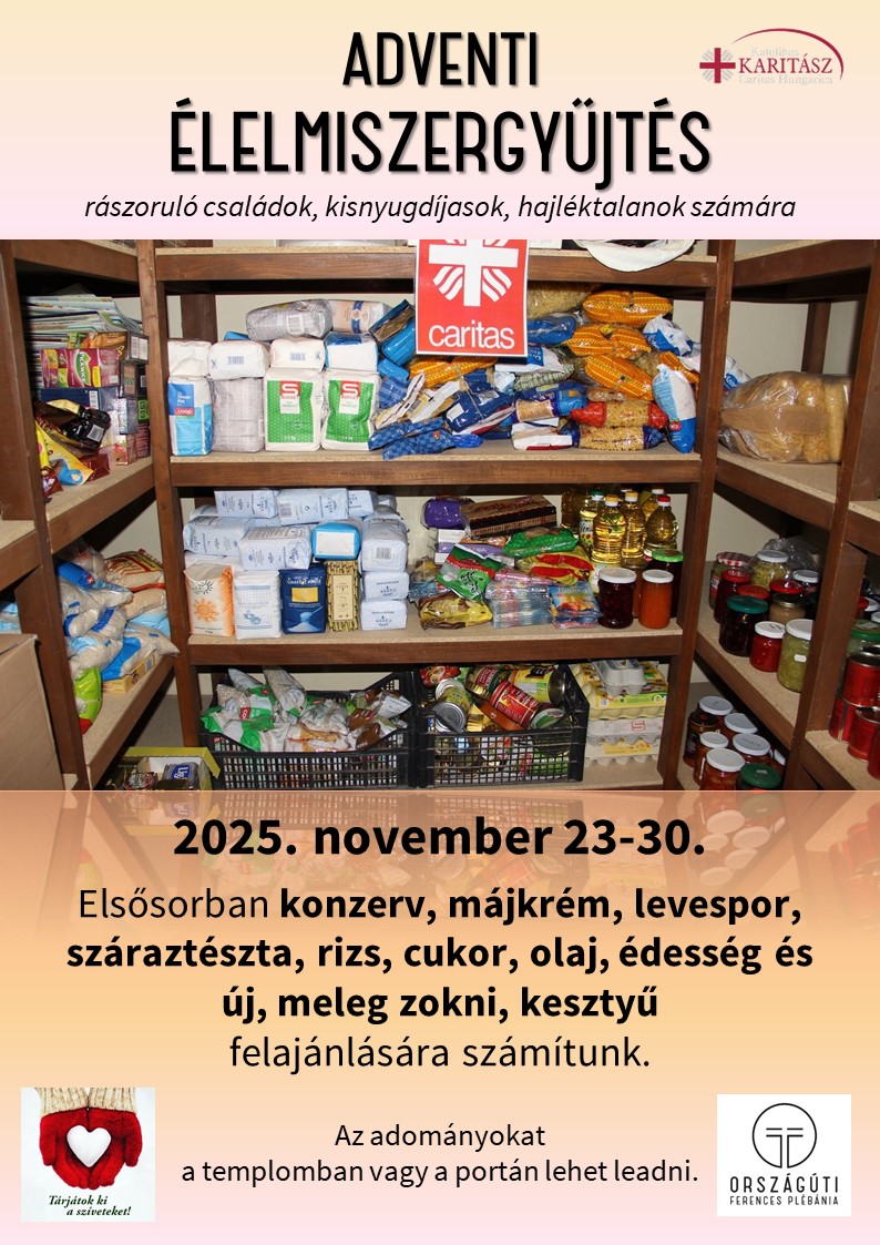 Kérjük a testvéreket, hogy karácsonyi készületük során külön figyelemmel forduljanak a rászoruló családok felé és lehetőségeikhez mérten tartós élelmiszerrel segítsék a nehézségekkel küzdők mindennapi megélhetését.
