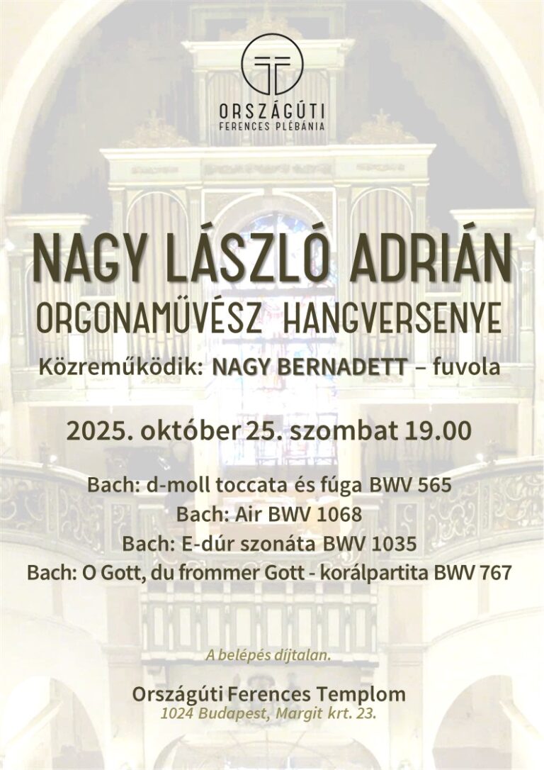 Nagy László Adrián orgonaművész és Nagy Bernadett fuvolaművész ad hangversenyt október 25-én, szombaton 19.00 órától templomunkban. A belépés ingyenes!